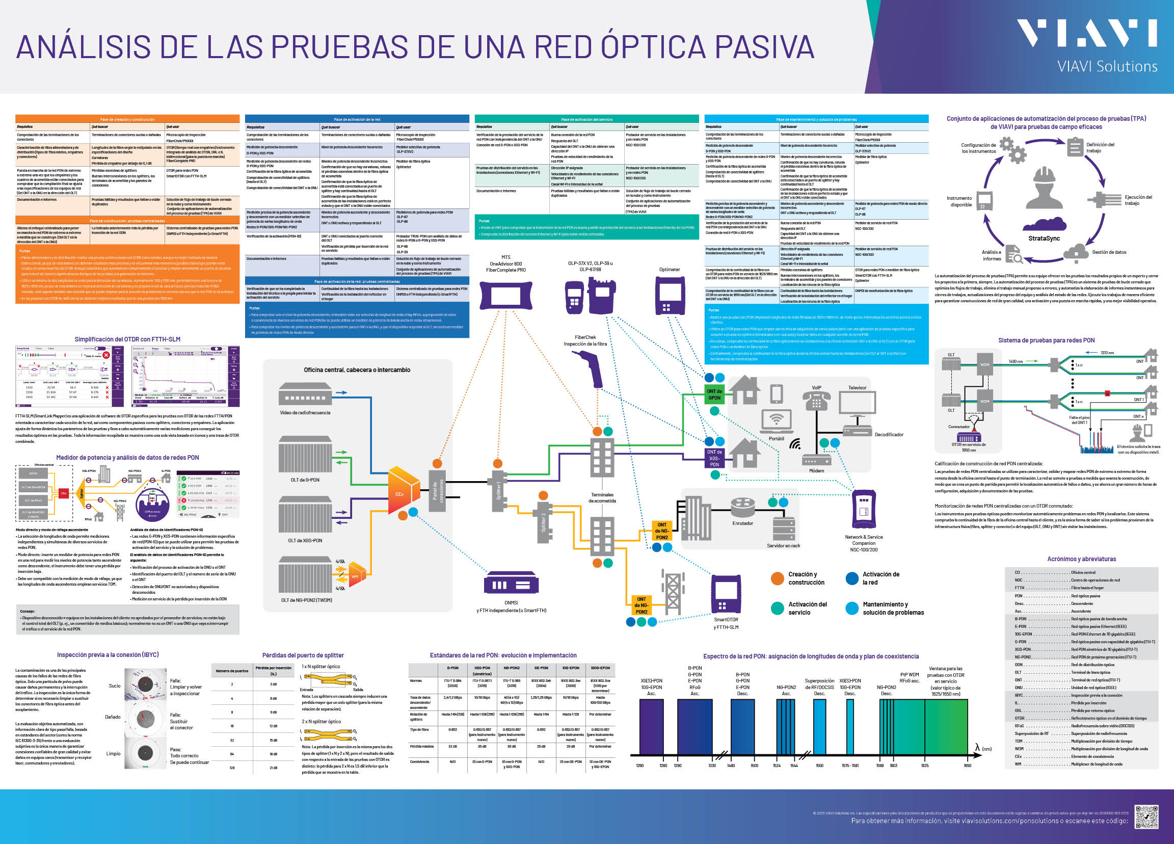 El póster sobre el análisis de las pruebas de redes ópticas pasivas (PON) de VIAVI Solutions está dirigido a contratistas, técnicos e ingenieros de fibra óptica implicados en cualquiera de cada uno de los aspectos del diseño, la implementación, las instalaciones para clientes y el mantenimiento de las redes PON. Ofrece una descripción general de la estructura y los componentes de una red PON, un resumen de los estándares del servicio, las longitudes de onda del servicio y cómo coexisten. Asimismo, proporciona los requisitos de las pruebas, qué aspectos comprobar, los tipos de herramientas para pruebas que se necesitan y consejos de cara a las pruebas, todo ello para las cuatro fases principales del ciclo de vida de las redes PON: