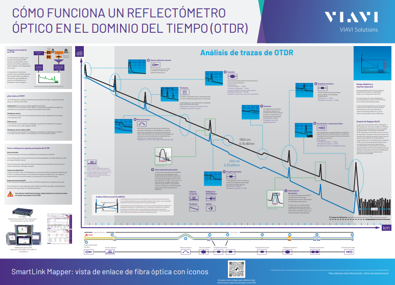 Aprenda qué mide OTDR y cómo configurar los ajustes de OTDR. El póster también sirve como guía para el análisis de trazas OTDR y las vistas de enlace de fibra basadas en iconos de Smart Link Mapper.